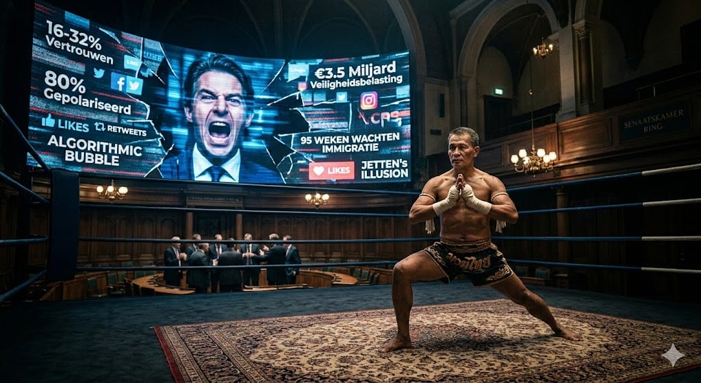 Project this distorted, commercialized dynamic onto politics as the ‘art’ of collective governance and conflict resolution, where at best every action, debate, and concession is governed by the described values of respect, emotional control, and mutual growth through failure, and you witness a tragic, recognizable caricature: replace Bruce Lee’s transcendental, adaptive ethos with Rob Jetten’s ostensibly sporty daring, the Muay Thai ring with the coveted Chambers of the States General, and the sparring partner with a fragile coalition of opportunism and identity politics. Jetten, who profiles himself as a boxing enthusiast with ambitious, physically disciplined mindset, seems bitterly ignorant of martial arts’ deeper core as life metaphor—his sharp, confrontational rhetoric, obsessive coalition drive, and focus on visible, measurable ‘wins’ in polls and headlines align seamlessly with promoters keeping the show profitable, not Lee’s timeless principle of “absorb what is useful, reject what is useless,” prioritizing radical adaptation, self-knowledge, and ego release over fleeting dominance. In 2026, trust in his vulnerable minority cabinet plummets to historic lows (16-32%), while polarization explodes via social media echo chambers and algorithmic bubbles—likes, retweets, and viral clips now fully dictate the political agenda, at the expense of philosophical depth, turning real failure into sustainable growth and institutional resilience.